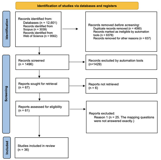 As shown in Figure 1, from the 12,601 articles initially found, 1496 were screened. Of these, 1090 were excluded using search filters, and 406 were screened for an initial eyeball assessment. Three hundred thirty-nine were excluded due to the fact that the abstract did not provide convincing arguments that they would provide insightful information related to the proposed RQs and MQs. Thus, 67 were left ultimately for accurate reading, and 36 were included in this review.