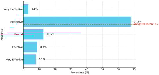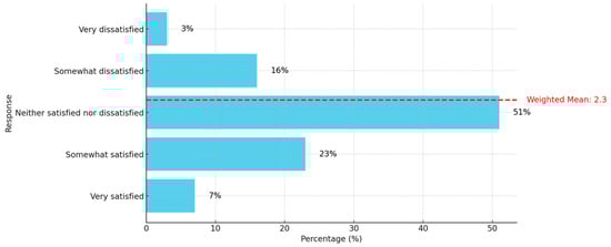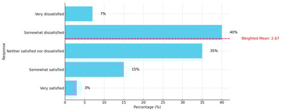As illustrated in Figure 3, most participants (67.9%) perceive the current policies as ineffective, with an additional 12.6% finding them very ineffective. The red dashed line represents a weighted mean of 2.20, suggesting that the average perception of the policies falls between ineffective and neutral but leans more towards ineffective. These data highlight a significant shortcoming in the existing policies, indicating that they are not positively impacting the participants, as they are not achieving their objectives. Consequently, there is a need to explore participants’ views on the available resources supporting these policies, regardless of the institution. Figure 4 illustrates the extent of their satisfaction with the support and resources provided by their respective institutions.