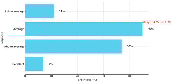 Figure 6 shows that many responses focused on the average and above-average categories, with 45% of participants rating the performance as average and 37% as above average. The weighted mean of 2.38 further underscores that the general perception of performance skews towards moderate to slightly above moderate. However, the 11% of respondents indicating below average highlight critical areas requiring targeted improvements.