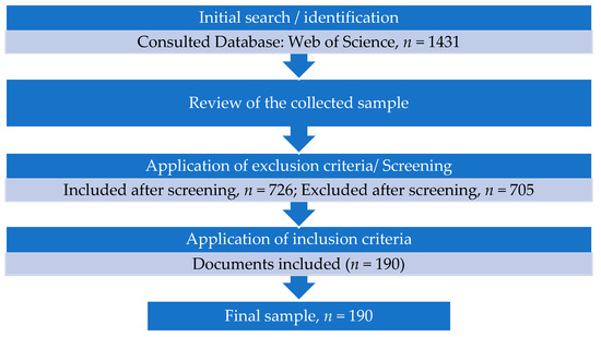 In recent years, there has been an increase in research on audiovisual fiction and coeducation due to the proliferation of television series and films. This study used a descriptive, retrospective, and quantitative analysis of scientific production about coeducation and its relationship to audiovisual productions between 1986 and 2023. According to the scientometric paradigm, a bibliometric approach is ideal for examining the quantitative aspects of scientific literature. This approach provides an objective and systematic vision of the multiple dimensions that appear in the scientific field, serving as a fundamental tool for understanding the field of study, providing information about a country or area of knowledge, and supporting the analysis of production and scientific performance [21]. A bibliometric design is appropriate for analyzing scientific production, detecting co-citation and coauthorship networks, and investigating evolutionary oscillations in the production process. Two phases comprise the research process. The first step of the study is to undertake a scientific mapping through a study of scientific publications obtained from one of the top scientific databases, the Web of Science Collection. For this purpose, the search equation in Table 1 was used, setting the date of the search until 5 October 2023, in 1431 publications. In the second step, we selected scientific texts according to predetermined exclusion and inclusion criteria, resulting in 190 documents for the final sample, as shown in a flow chart (see Figure 1). This is followed by an analysis of scientific evolution, which identifies four stages based on oscillations or variations (1986–2010, 2011–2015, 2016–2020, and 2021–2023). As a result, the publications have been reviewed in depth, delving into titles, summaries, and keywords and examining the content of the most important papers. The study’s second phase will involve an evaluative analysis of the scientific network and an analysis of the behavior of bibliometric indicators [22] to understand the relationship between countries, institutions, authorship, publications and sources, and the scientific production in each country. Moreover, we examine the networks of coauthorships, institutions, and co-citations of the most cited individuals.