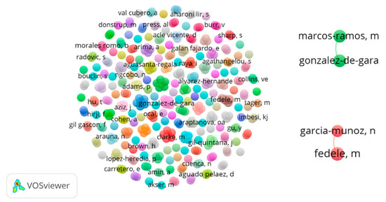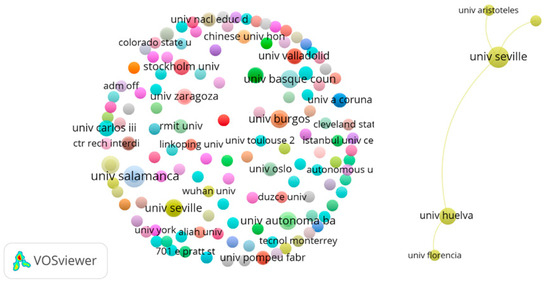 The co-authorship network analysis reveals that 195 organizations linked to the study are involved. There are 130 clusters, of which 126 are made up of institutions that have no links with the others, as can be seen on the left side of Figure 3. On the other hand, there are 4 clusters with 5 connected institutions: the University of Huelva, the University of Florence, the University of Seville, the University of Thessaloniki, and the University of Cadiz (right side of Figure 3).