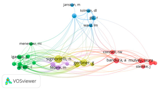 Using the co-citation analysis (Figure 5), we identify the authors most frequently cited by the research in our sample, thus supporting the theoretical foundation for our study. The analysis identified 5703 references, with 29 having nine or more co-citations. Using the VOSviewer program, the analysis grouped these references into five clusters and assigned each cluster a color (red, yellow, blue, green, purple). A network led by a red cluster, composed of nine individuals, has been identified, highlighting Mulvey (n = 20) and Steinke (n = 12), key figures in women’s cinema and media literacy. We also find Foucault (n = 22), one of the most influential philosophers of the 20th century, and Bandura, the father of the “social learning theory”. In the second largest cluster (n = 8), in green, We find that one of the most prominent references in audiovisual fiction and coeducation is Belmonte (n = 11) from the University of Barcelona. Carlos III University’s Galán-Fajardo (n = 12) is also a leading authority in gender construction, adolescents, and audiovisual fiction. Additionally, we find Igartua (n = 15), head of the Audiovisual Content Observatory, and Lacalle (n = 16), director of the Spanish Fiction and New Technologies Observatory. As a result of the analysis of the five clusters, yellow dominates the center of the research (n = 4), highlighting references from sociology and gender studies. Additionally, we identify Gerbner and Signorielli, the proponents of the “cultivation theory”; and we contact Lauzen, the director of the Center for the Study of Women in Television and Film. The size of the nodes of the four individuals mentioned suggests that they have the highest degree of citations and connections. A blue cluster (n = 5), located at the top of the map, is devoted to feminism and sociology research. In terms of equality education, McRobbie, Tolman, Jansson, and Gill are experts in these fields. The last cluster (purple), with three authors, is closely related to the yellow and green clusters. We observed authors in the field of audiovisual coeducation, including Fedele (n = 16) and Masanet (n = 16).