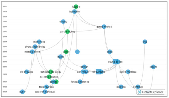 In bibliometric maps, authors, concepts, and areas of a scientific reality are graphically represented [24]. By interpreting these maps, we can identify clusters, notable nodes, and the connections between them, which provides a visual representation of the dynamics of our study object [25]. Clustering is the process of grouping the nodes in a scientific map so that we can determine the types of relationships between them (word, term, or document). Furthermore, the data were exported to CitNetExplorer, which allows the grouping of publications according to the linking of citations, enabling visualization of citation networks over time.