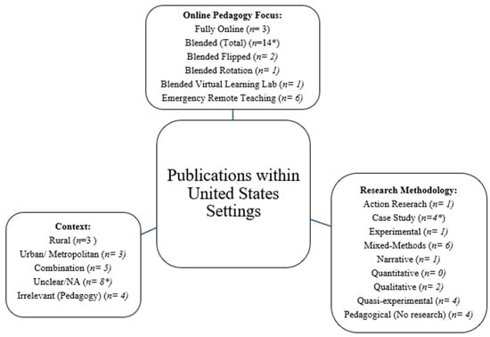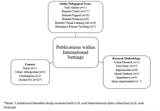 As demonstrated in Figure 1 and Figure 2, the methodologies employed throughout the selected studies reveal diversity in the quantitative and qualitative approaches to middle-grade online pedagogies research. Scoping reviews do not call for a systematic review of research methodologies or approaches to data collection and analysis [22]. While we did not exclude studies based on the researchers’ methodology, we identified some commonalities in methodological choice and approach across the literature. For example, the most frequently cited research methodologies across all of the literature utilized mixed-methods or quasi-experimental. Mixed-methods studies were evident in six publications of U.S.-based studies and five publications of internationally based studies. Of these 11 publications, 1 study centered fully on online contexts, 7 focused on an aspect of blended instruction, and 3 drew attention to ERT. Quasi-experimental research was also a frequent form of research methodology, with 11 of the identified studies utilizing this methodology. The least utilized methodology within the literature was narrative research, with just one study utilizing this approach to the research [28].