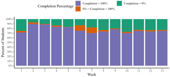 Here, it should be noted that because each chapter’s content was only included on one exam throughout the semester, the indices j and t are tantamount to the same. However, as Figure 1 shows, there is some weekly variation in adaptive learning assignment completion. Exam question correctness is undoubtedly affected by week-to-week assignment completion; however, it is also impacted by the content progression itself (i.e., more difficult units are likely to have lower exam question correctness, regardless of weekly variation in assignment completion). To account for this fact, along with the myriad of unobserved factors that influence exam question correctness, the regression models presented in this study include fixed effects for each student, week, and unit.