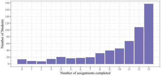 Average student adaptive assignment completion frequency was mostly consistent over time, but individual student completion frequency over time was more varied. Students could choose whether to complete adaptive assignments from week to week, which this study’s hypothesis suggests will impact correctness on matched exam questions from that week. Figure 1 shows the percentage of students that completed the adaptive learning assignments throughout the semester. Participation remained relatively high and consistent after the first two weeks. Figure 2 demonstrates that a large number of students completed all 13 assigned adaptive learning activities over the course of the semester (34%).