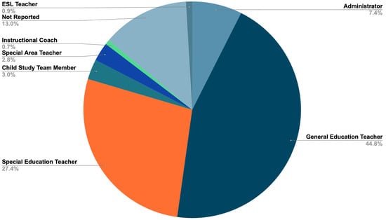 Furthermore, only 26 participating schools utilized the same pre- and post-assessments across the implementation period. Of the 26 participating schools, 12 were elementary school level, 3 were elementary/middle school level, 6 were middle school level, 2 were middle/high school level, and 3 were high school level. Participants included administrators, general education teachers, special education teachers, related service providers, and other school staff members as part of a contingency within the grant. The majority of the participants were general and special education teachers. See Figure 1 for a breakdown of the various roles of participants. A total of 431 school-based staff members participated across the 26 schools with analyzable data, with an average of 16.5 and a range of 5 to 42 participants per school. The sample consisted of 351 females, 68 males, and 12 individuals whose gender was not specified.
