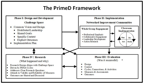 The relationship of research, evaluation, and PD has been framed as Research ON PD [44], Research AS PD [45], and [Research ON PD] as PD [46]. Examination of the NIC as a component of the PD requires another layer of evaluation and research (Phases III and IV), which is akin to Kirkwood and Christie’s [44] notion of Research ON PD. PrimeD seeks to focus the normal, everyday research activities of teachers into a professional, collaborative improvement driver through PDSA cycles. By integrating classroom research into PD, PrimeD also supports the notion of Research AS PD [45]. The interactions of Phase II, Phase III, and Phase IV offer the opportunity to also conduct [Research ON PD] AS PD [46].