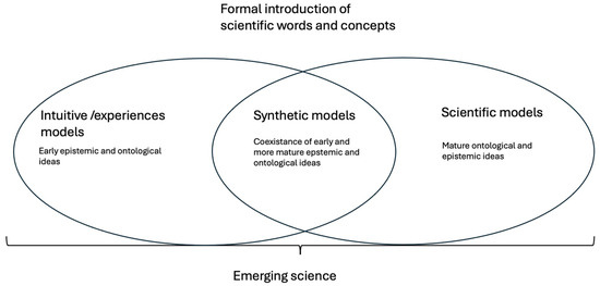 Introducing scientific concepts in a formal manner poses a challenge for children as they try to reconcile their sensory-based ideas with more abstract explanations of their surrounding phenomena. This procedure stimulates broader tectonic shifts in the epistemic and ontological principles of children [31]. As children commence their acquisition of scientific knowledge, the development of synthetic models becomes apparent. These models are a creative blend of intuitive and counterintuitive concepts (see Figure 2 and Table 2). In the framework theory, this change can be described as a progression from intuitive models to synthetic models and eventually to scientific models.