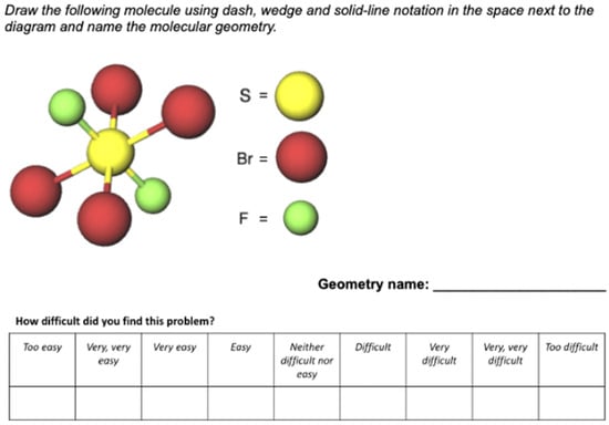 The pre-test assessed participants’ prior content knowledge and associated levels of cognitive load. The six test questions were contained in a test booklet, with each participant given 10 min to complete the test for a total of 14 marks. The pre-test collected participants’ baseline prior knowledge and cognitive load data. Cognitive load was measured using self-reporting methods by participants responding to the perceived difficulty based on a 9-point Likert scale from ‘too easy’ to ‘too difficult’ (refer to Figure 2). Utilising subjective measures of task difficulty via Likert scales has been extensively demonstrated to be a reliable and valid method [48], especially for implementation with more complex tasks [49]. This approach has also had its effectiveness demonstrated in similar studies regarding the relationship between CL and achievement when implementing AR technologies into the study of geometric principles in chemistry comparable to this study [11,50,51]. The two post-tests were designed with isomorphic questions being incorporated in the content section of the pre-test, again with each question accompanying the prompt to measure cognitive load.