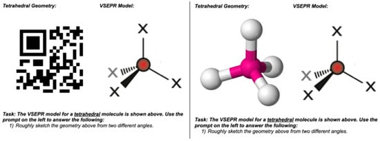 A treatment lesson at T2 was undertaken based on molecular geometric and Valence Shell Electron Pair Repulsion (VSEPR) theory content. Identical booklets were provided to the I and C groups differing only in the inclusion or exclusion of an AR digital prompt that accompanied the VSEPR model of the molecular geometry. The digital prompt was to be used with an app downloaded onto each participant’s mobile device to generate an interactive 3D model of the molecular geometry. In lieu of the digital prompt, the C group was instead given diagrams typical of that which would accompany this content in a more traditional lesson or textbook (refer to Figure 3). Teacher instruction given during the teaching aspect of the class was controlled by utilising the same lesson slides during both sessions.