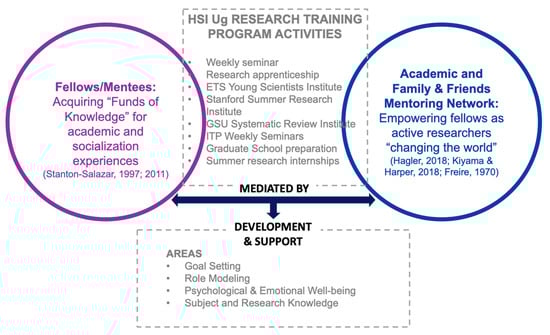 According to Kiyama and Harper [], family and friends are resources for students who can assist with their academic goals, persistence, and degree attainment, even though institutions of higher education might miss or disregard these important contributions toward student success. This is especially true for students from underrepresented backgrounds, such as families of color, first-generation, and low-income families []. Moreover, several studies have noted that diverse families and those from collectivist orientations become one of the most important assets that lead to college student success []. Therefore, in our undergraduate research training model for HSIs, we draw on a more inclusive lens and consider diverse families’ and friends’ engagement as an asset in supporting their children’s education in college and graduate school. Thus, it is natural that we explicitly integrate families and friends as part of our HSI undergraduate research training program’s mentoring network as part of our conceptual framework, as displayed in Figure 1.