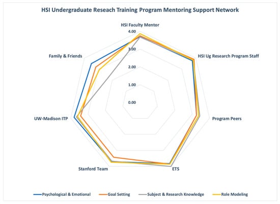 Based on our results, our conclusion is consistent with previous studies calling for the need to establish a more inclusive lens to engage diverse families as part of their children’s college experience for student success [,]. Our study is supported in this earlier work [,] by providing a theoretically informed framework for our HSI undergraduate research training program that intentionally incorporates family and friends as part of students’ mentoring network. This study extends the findings from these previous studies by identifying more specifically the type of support that family and friends can provide for student success in college graduation and graduate school preparation. We conclude that for students participating in the HSI undergraduate research training program, the role of family and friends is perceived to be as strong as the one provided by other academic mentors in their mentoring network in socio-emotional development and goal setting. The role of family and friends is perceived as strong as their program peers in role modeling, although it is stronger for other academic mentors in the same category. Students perceived the lowest support from their family and friends in the subject and research knowledge category when compared to their academic mentors and their program peers.