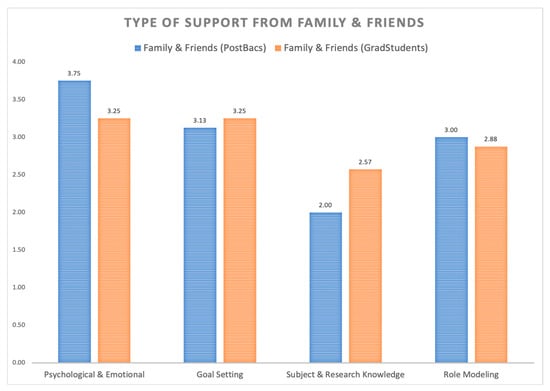 Figure 3 shows that in the category of psychological and emotional support, post-baccalaureates reported a higher score (+0.5) of support from their family and friends than those who went into graduate programs, with both groups reporting a strong level of support. Graduates reported a similar score for support received from family and friends in goal setting, which was also similar to the score from post-baccalaureates in the same category. The score for role modeling was similar for both groups (post-baccalaureates and graduates), reporting quite a bit of support. Post-baccalaureates reported the lowest score for support received from family and friends in the category for subject and research knowledge, with a score of two (some support), whereas graduates provided a higher score (2.57) in this category.