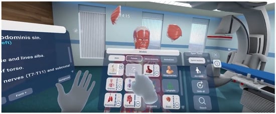 In the biomedical course, the Human Anatomy application was utilized (Figure 2). The Human Anatomy application is an immersive and educational tool available on Meta Quest designed to facilitate learning about the human body through virtual reality. The application features interactive 3D anatomical models that allow users to visualize and explore the complex structures of the human body [33]. With advanced graphic capabilities, the application provides a highly immersive environment, making the study of anatomy more engaging and effective. Users can interact with these models by rotating, zooming in, and examining different parts of the body, which facilitates a deeper understanding of various systems, including the skeletal, muscular, and circulatory systems.