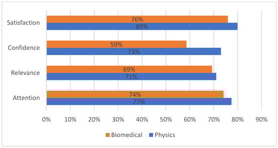 The reliability of the instrument was validated using Cronbach’s alpha. In the physics course, the values for the attention, confidence, and satisfaction dimensions were above 0.8, indicating excellent reliability. Cronbach’s alpha value for the relevance dimension was 0.78, suggesting good reliability. Additionally, the overall reliability for the instrument was 0.95. In the biomedical course, the values for each dimension also indicated very good reliability, with the total reliability score being 0.97, closely mirroring its application in the physics course.