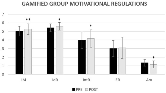 Descriptive data of the motivational regulations for GG showing the changes produced between the pre- and posttest. *: p < 0.05; **: p < 0.001. IM = Intrinsic Motivation; IdR = Identified Regulation; IntR = Introjected Regulation; ER = External Regulation; Am = Amotivation.