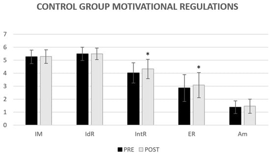 Descriptive data of the motivational regulations for CG, showing the changes produced between the pre- and post-test. *: p < 0.05. IM = Intrinsic Motivation; IdR = Identified Regulation; IntR = Introjected Regulation; ER = External Regulation; Am = Amotivation.