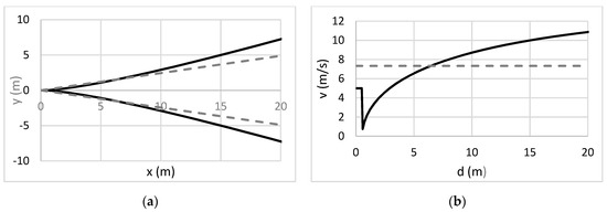The second parameter is each opponent’s moving velocity (Vopponent). This is more complex as it depends on the range. As an example, below (Figure 2b—right side) is a composite plot of an arm moving 0.5 m in 0.1 s (5 m/s) plus Usain Bolt’s 100 m dash world record velocity-displacement profile (starting from blocks) plus a 0.146 s reaction time (data adapted from Helene and Yamashita [24]). The real velocity profile of a student-player is much slower but equally complex, so we simply used a constant average value obtained in our data that was defined at 6.15 m/s, representative of the mean speed of all student-players (v = 1.15 m/s) plus the moving arm speed (v = 5 m/s). We just assumed that the opponent could immediately start moving at that average velocity and ignore the reaction time and if he/she was already moving or not. The line patterns marking the exclusion zone in Figure 2a are matched with the opponent’s velocity profiles of Figure 2b. The significant differences between the computed ball interception areas started to appear for passes longer than 10 m, which in our data set, represented 4.08% of total passes.