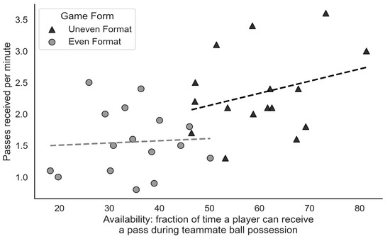 Thus, to explore the relationship between the number of created passing lanes (or time being in an ‘open’ position) and the number of passes received, Figure 3 visually represents the results for both game forms. Each point on the graph represents a specific player’s time spent in an ‘open’ position and the number of passes they received while playing the game form in question. It is possible to observe not only that there are two almost pure clusters of students based on the game forms but as well, as seen by the regression lines, the ‘uneven’ game form rewarded the students that had more time available with more passes received per minute than the ‘even’ game form.