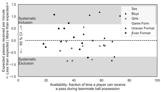 Figure 4 explores the relationship between time spent in an ‘open’ positioning and passes received per minute by comparing expected and actual passes received. It also examines potential gender biases by separating boys and girls. Interestingly, both genders seem equally excluded (‘exclusion zone’), but only boys tended to consistently be included (‘inclusion zone’) in the game.