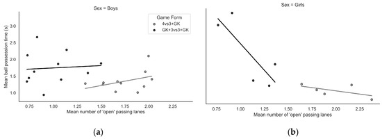 Plots exploring the relationship between the mean number of passing lanes and the mean individual ball possession time (in seconds) for boys (a) and girls (b). A line drawn through the points for each group (boys and girls), obtained when playing different games, attempts to understand their effects better.