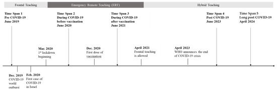 The above timeline illustrates the transitions of teaching environments from face-to-face to blended/hybrid due to the COVID-19 pandemic. Initially, the learning environment was face-to-face, and it was predominant until February 2020 (pre-COVID-19 time span). Following the first case of COVID-19 in Israel in February 2020 and the onset of the first lockdown in March 2020, the learning environment changed to emergency remote teaching (ERT), predominantly synchronous (COVID-19 before vaccination time span), and it lasted until December 2020. After the first dose of the vaccine, from January 2021 (COVID-19 after-vaccination time span), emergency remote teaching environments predominated. By April 2021, face-to-face was permitted again, and since May 2023, teaching has transitioned to a blended/hybrid model (post-COVID-19 time span). As of April 2024, blended/hybrid teaching continues (long post-COVID-19 time span).