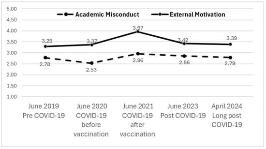 Figure 2 presents the changes in academic misconduct and external motivation throughout the five periods. Both variables showed similar trends, with an overall increase during the pandemic after vaccination took place and a decrease after the pandemic, back to pre-COVID-19 levels.