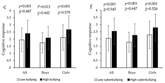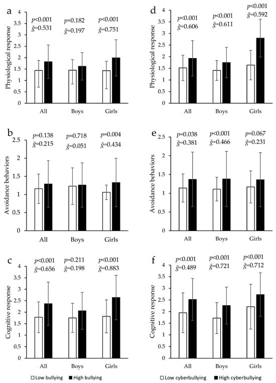 Young bullying victims (Figure 1a–c) showed significantly higher values than those students who had not been victims of bullying in physiological responses (diarrhoea, palpitations, chest tightness, nausea and fainting): 25.69% (1.44 ± 0.44 vs. 1.81 ± 0.74 a.u.) F(1, 714) = 36.563, p < 0.001, ğ = 0.531, 1-β = 0.999; and in cognitive responses (difficulty concentrating and thoughts interfering with the ability to process and solve problems): 33.14% (1.78 ± 0.672 vs. 2.37 ± 0.94 a.u.) F(1, 714) = 51.339, p < 0.001, ğ = 0.656, 1-β = 0.999 (Figure 1a–c). Results by gender showed that girls who were victimized by bullying had significantly higher values for all anxiety behaviors than those who were not victimized (all p < 0.004). No significant differences were found in any anxiety behavior in boys as a function of bullying victimization (all p > 0.05). On the other hand, cybervictimized adolescents showed higher scores than non-victims for all anxiety factors: physiological responses: 26.97% (1.52 ± 0.55 vs. 1.93 ± 0.76 a.u.) F(1, 714) = 66.815, p < 0.001, ğ = 0.606, 1-β = 0. 999; avoidance behaviors: 20.18% (1.14 ± 0.38 vs. 1.37 ± 0.73 a.u.) F(1, 714) = 25.211, p < 0.038, ğ = 0.381, 1-β = 0.999; and cognitive responses: 22.56% (1.95 ± 0.86 vs. 2.52 ± 0.91 a.u.) F(1, 714) = 76.576, p < 0.001, ğ = 0.489, 1-β = 0.999. Similarly, the results segmented by gender (boys and girls) were significant in all cases (all p < 0.001), except avoidance behaviors in girls (p = 0.067) (see Figure 1d–f).