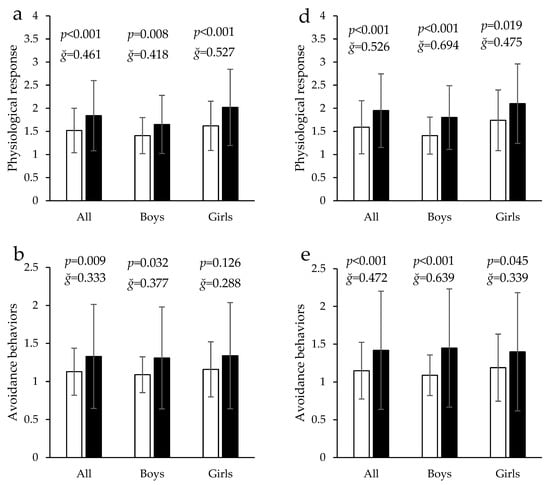 Boys and girls who reported committing aggression had higher scores than those who did not commit aggression on all dimensions of test anxiety: physiological responses: 21.05% (1.52 ± 0.48 vs. 1.84 ± 0.76 a.u.) F(1, 714) = 31.648, p < 0.001, ğ = 0.461, 1-β = 1.000; avoidance behaviors: 17.69% (1.13 ± 0.31 vs. 1.33 ± 0.68 a.u.) F(1, 714) = 13.849, p < 0.009, ğ = 0.333, 1-β = 0. 960; and cognitive responses: 22.56% (1.95 ± 0.83 vs. 2.39 ±0.93 a.u.) F(1, 714) = 38.950, p < 0.001, ğ = 0.487, 1-β = 1.000 (Figure 2a–c). The results, segmented by gender, showed that both male and female aggressors achieved higher scores on all anxiety dimensions with respect to their non-aggressor peers (all p < 0.032), except avoidance behaviors in girls (p = 0.126). Similarly, cyberbullying male and female aggressors presented higher values than non-aggressors in all anxiety factors: physiological responses: 22.64% (1.59 ± 0.57 vs. 1.95 ± 0.80 a.u.) F(1, 714) = 46.689, p < 0.001, ğ = 0.526, 1-β = 1.000; avoidance behaviors: 24.56% (1.14 ± 0.37 vs. 1.42 ± 0.78 a.u.) F(1, 714) = 33.932, p < 0.001, ğ = 0.472, 1-β = 1.000; and cognitive responses: 23.9% (2.05 ± 0.88 vs. 2.54 ± 0.92 a.u.) F(1, 714) = 52.709, p < 0.001, ğ = 0.545, 1-β = 1.000 (Figure 2d–f).