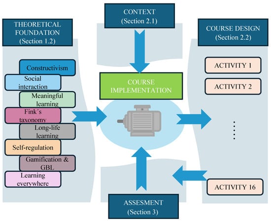 Scheme of the elements in the course design and correspondence with sections in the paper.