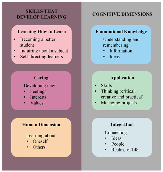 Fink’s taxonomy: cognitive dimensions (right-hand side) and skills that enable significant learning (left-hand side).