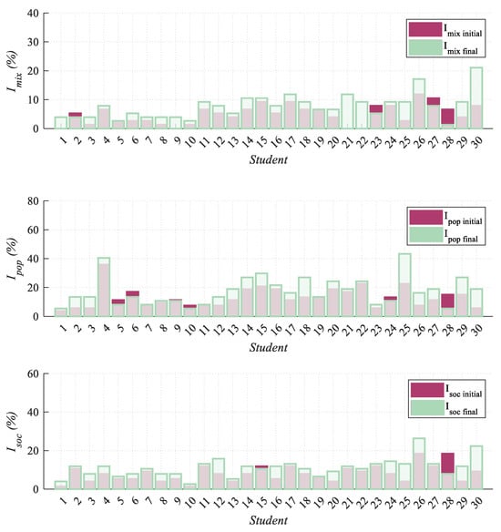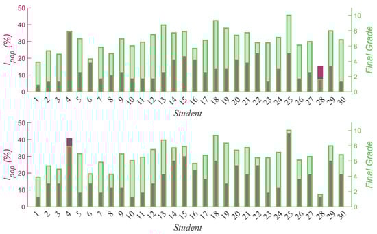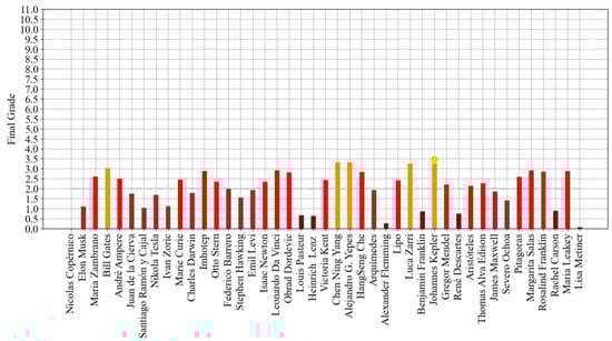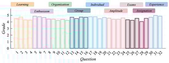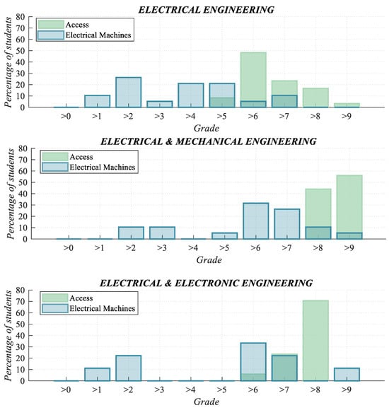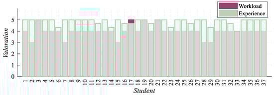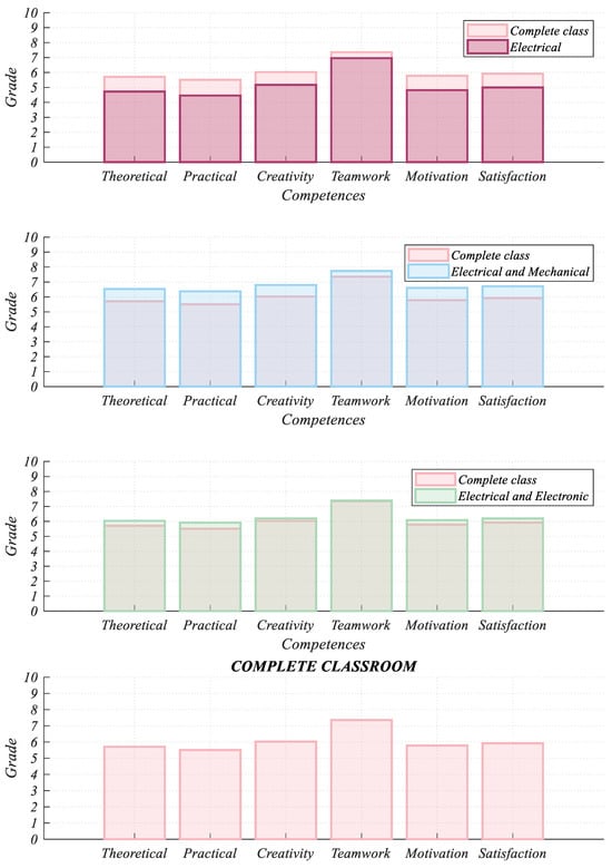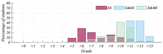 Focusing on learner profiles, there is a heterogeneous population if the cutting-edge mark to access the degree is considered as the basis of the comparison. In EE the required mark is 5.0/14, whereas for E&EE this value increases significantly up to 7.85/14. The required mark is even higher in the E&ME, being the entry mark of 11.3/14. Table 1 shows the cutting-edge marks to access the degrees and the number of students of each degree in EM2 (course 2022–2023), whereas Figure 5 details the distribution of the cut-off, marks for all students in the three degrees under study. As detailed in Table 1, the population of the classroom is heterogeneous according to the required cutting-edge scores to access to the degree. Figure 5 further details the aforementioned difference by showing in a bar graph the scores obtained by students to enter the three degrees. Blue bars are used for E&ME, noting that marks are mostly concentrated in scores over 11, whereas green and red bars are used to show the scores for E&EE and EE, respectively. In the latter case, red bars indicate that the scores of EE students are mostly concentrated between 5 and 6 over 14, which is a rather low cut-off mark for an engineering degree compared to the standard in previous years. This scenario can generate a certain complexity for the teachers when the goal is to obtain high motivation in all students. It is also worth noting that the number of participants is relatively high (75 in course 2022/2023), hence the promotion of AL also becomes particularly challenging.