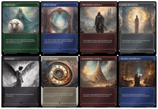 Gamified sessions from (ii) are enriched with the use of some cards that are given to students at the beginning of the session. These cards have been specifically designed by the professors not only to entertain, but also to promote social relationships between groups. The designed cards are shown in Figure 6 and the description can be found below: