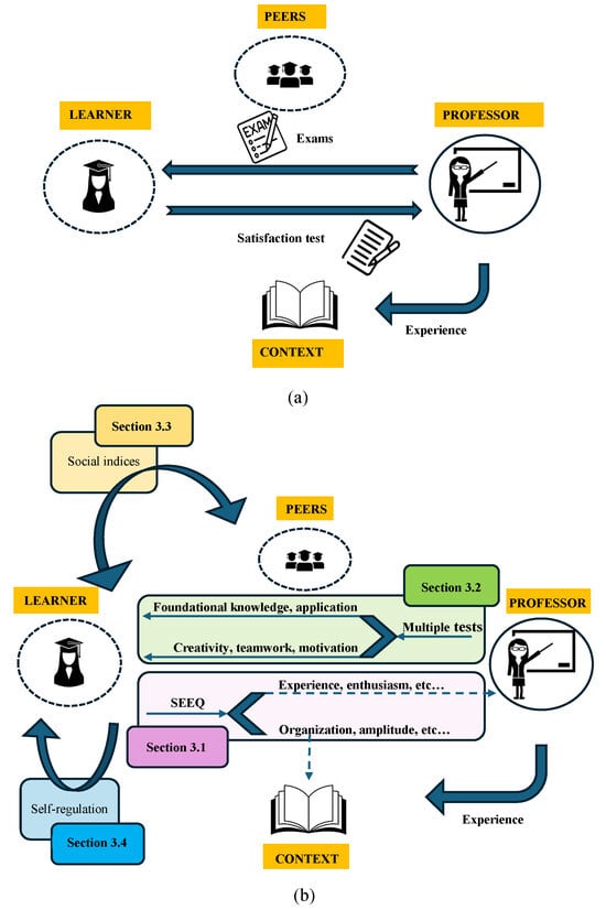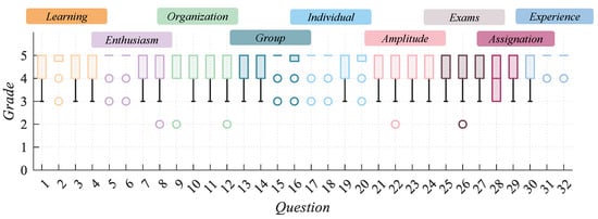 - (C3) The design and the assessment (see Section 3) approach permits the educational action and evaluation from multiple perspectives: from teacher to learning (grades), students to teacher (satisfaction), students to student (sociability) and student to him/herself (self-regulation).