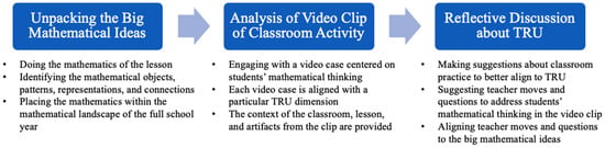 Each meeting of the teacher community uses the following components: (a) unpacking the big mathematical ideas in an FAL, (b) making observations about a video case demonstrating students’ mathematical thinking while engaging in an FAL, and (c) sets of reflective discussion questions about the video case and the mathematics, based on one of the TRU dimensions (see Figure 1). During the reflective discussion of the video analysis, teachers often co-construct understandings about TRU-aligned teaching practices through dialogue (Leonard et al., 2022).