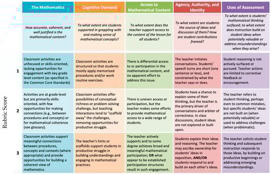 - Schoenfeld, A. H., Floden, R. E., & the Algebra Teaching Study and Mathematics Assessment Project. (2014). The TRU math scoring rubric. Graduate School of Education, University of California, Berkeley & College of Education, Michigan State University. Available online: http://ats.berkeley.edu/tools.html (accessed on 11 December 2023).