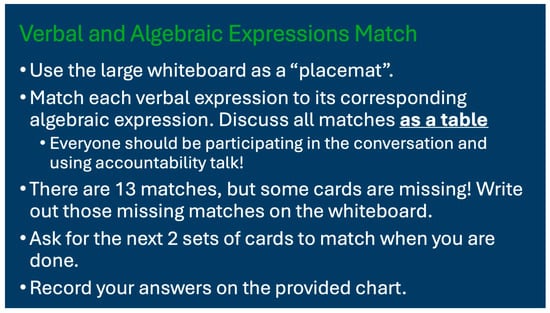 There was also evidence of changes in the way Ms. Chaves supported students to come to mathematical conclusions through purposeful questioning within the FAL lesson plans. As presented in the previous section, in year 1, Ms. Chaves would modify the intended FAL by removing particular aspects of the lesson plan. During the year 1 classroom observation, we observed how Ms. Chaves modified the FAL’s card sort activity by removing a pair of matching cards and providing students with information about the number of matches. To introduce the task, the FAL includes a collaborative warmup activity with three algebraic expressions and three written sentences. Students are asked to match the algebraic expression with the written sentence. The warmup is designed to have students tackle the dilemma that not every card will have a match. Ms. Chaves did not have students engage in this part of the FAL. Instead, Ms. Chaves displayed the slide in Figure 3.