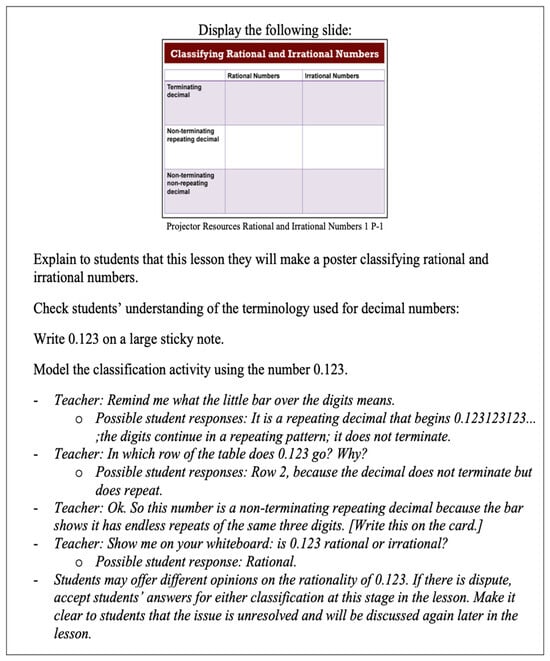 During year 4, when Ms. Chaves self-reported following the FAL lesson plans, more closely, we verified this through the classroom observation. While launching an FAL on classifying rational and irrational numbers, Ms. Chaves asked students to determine if 0.123 was a terminating, non-terminating repeating, or non-terminating non-repeating number. The FAL lesson plan prompts the teacher to write 0.123 on a large sticky note and model a classification activity using this number. In this classification activity, the teacher is prompted to ask particular questions, and the lesson plan provides potential student responses (see Figure 4).