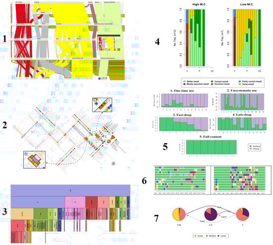 Different techniques for visualization of sequential data 1. Sankey-based visualizations (Riehmann et al., 2005) mostly used for highlighting transitions at some point of the sequence; 2. Matrix-based visualizations developed for comparing sequence differences (Zhao et al., 2015); 3. The icicle tree visualization (Wongsuphasawat et al., 2011) as an example of hierarchy-based visualizations, mostly emphasizing branching of sequences; 4. Sequence–Frequency Plot (6 states) as a visualization of students’ test-taking patterns (Opanasenko et al., 2024); 5. Sequence–Frequency Plot (2 states) as a visualization of temporal learning activity patterns (Opanasenko et al., 2023); 6. Sequence Index Plot showing specific sequences of participating in MOOC (Tan & Samavedham, 2022); 7. Transition Plot of simulated educational roles (Helske et al., 2024).