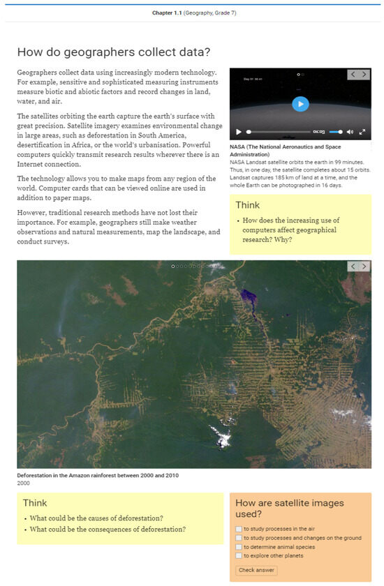 Opiq is a cloud-based learning environment that contains interactive E-Books from Opiq educational publishers. Currently, there are 486 E-Books available in Estonian, English and Russian languages that cover most of the school subjects for preschool, middle, and high school. Since there are 16 publishers and content providers whose E-Books are presented in Opiq, the design of the E-Books could be quite different in the matter of interactivity. Opiq provides a wide number of possible interactions, including reading chapters, switching slides, watching videos, opening the gallery, taking tests including phases of checking, saving, and fixing results, which are also available for follow-up analyses. An example of an interactive E-Books page in the Opiq environment is presented in Figure 4. Opiq’s usage log-data provides information about every action that has been made by the student during their interaction with E-Books, which makes further EDM analysis available.