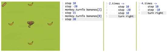 CodeMonkey is a game-based, challenge-driven learning platform that fosters the development of CT in elementary and secondary school students. The platform comprises 17 worlds, each containing 6–15 levels designed to target a specific CT concept or sub-concept, such as sequencing, data manipulation via arrays and indexing, and loop construction using for or times-loops. Students are presented with coding challenges in the form of levels, where they must use computational thinking. There are 200 levels in total. In each level of the game, students assist the main character, a monkey, in collecting bananas while overcoming various obstacles. Students write code to operate the monkey’s movement; however, no prior programming knowledge is required. Students can drag and drop pre-defined code blocks to create their code, eliminating the need to write lines of code from scratch. Advancing from one level to the next is possible only after completing a previous level.
