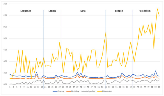 This index describes how creativity is manifested in solutions within the CodeMonkey environment. In our analysis of computational creativity, we only referred to correct solutions, omitting all other logged solution attempts. We referred to four creativity measures, Fluency, Flexibility, Originality, and Elaboration, which were computed for each level separately and then averaged across all levels.