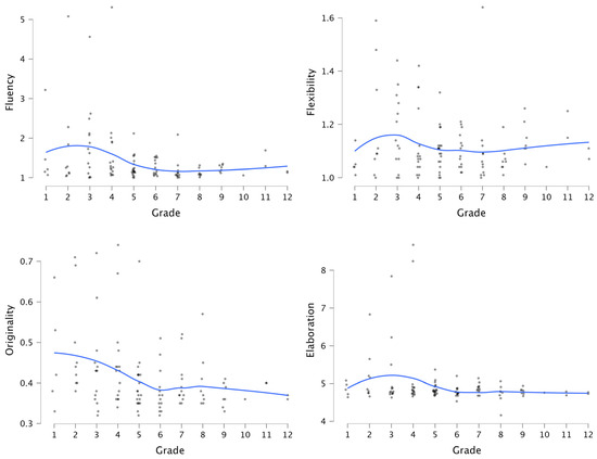 A Loess line was imposed in the Flexplot to approximate the relationship between the variables. The overall trend of Fluency generally increases between grades 1 and 3, decreases between grades 4 and 7, and remains mostly stable between grades 8 and 12 (Figure 3, top left). Flexibility behaves similarly, besides a steeper increase for the lower grades and a slight increase between grades 7 and 12 (Figure 3, top right). Originality demonstrated a steep decline between grades 1 and 6, followed by a moderate decline between grades 8 and 12 (Figure 3, bottom left). Elaboration shows a similar trend to Fluency (Figure 3, bottom right). Overall, these trends indicate negative relationships between creativity measures and grade levels, with computational creativity notably higher among students in the lower grades. This exploratory analysis suggested a divergence in the various computational creativity measures between grades 1–3 and 4–12. Note that this division was done prior to any analyses, based only on the abovementioned exploration. In the context of the Israeli education system—where this study was performed—this division is aligned with the common division of elementary schools (grades 1–6) to “lower elementary” and “higher elementary”, which includes grades 1–3 and grades 4–6, respectively. For example, during the COVID-19 global pandemic, when schools started to re-open after months of closure, grade 1–3 students were returned before grade 4–6 students, because of the unique needs—academically, socially, and emotionally—of the former.