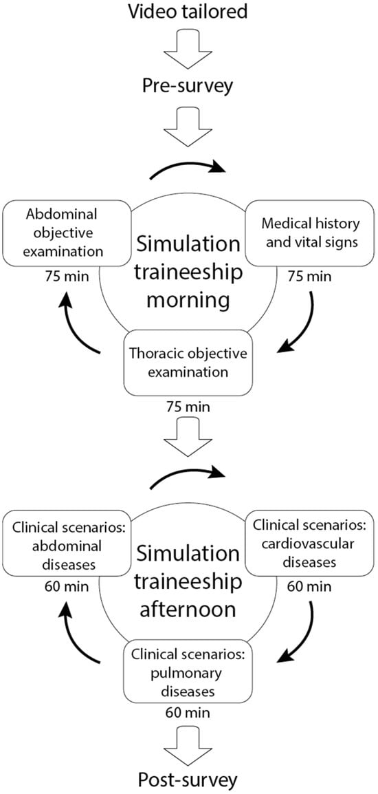 The simulation internship was a structured training program combining the flipped classroom approach and high-fidelity simulation-based learning. Ethical approval for the study was obtained in advance from the University of Turin Bioethics Committee, and students provided informed consent before starting the study, including access to instructional materials and participation in surveys.