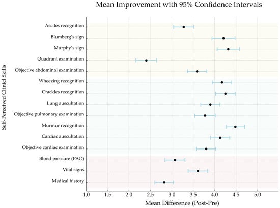 Post-intervention scores were consistently higher across all domains (p < 0.001). Both mean differences and changes in medians with interquartile ranges demonstrate substantial improvements in students’ self-perceptions of competence across various skills. These findings are further illustrated in Figure 2, which displays the mean differences in self-perceived clinical skills before and after the intervention, along with 95% confidence intervals. This visual representation supports the statistical results, providing a clear overview of the overall effectiveness of the combined flipped classroom and simulation-based training approach in enhancing students’ self-perceived clinical competence.