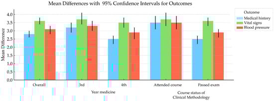 After the internship, the analysis showed significant improvements in self-perceived competence in medical history and vital signs measurement. Third-year students had lower baseline scores than fourth-year students, and students who attended the course scored lower than those who had passed the exam. ANCOVA confirmed that both year of study and prior course/exam status significantly influenced post-training scores. For medical history collection, the adjusted means were 7.78 for third-year and 7.92 for fourth-year students (F(1, 268) = 11.30, p < 0.001). For vital signs measurement, the adjusted means were 8.01 and 8.07 (F(1, 268) = 4.23, p = 0.04), and for blood pressure measurement, they were 7.76 and 7.90 (F(1, 268) = 6.15, p = 0.01). Third-year students and those who attended the course showed the most significant improvements. Pre- and post-training scores increased substantially. Medical history collection improved from a mean of 4.88 ± 2.01 to 7.85 ± 1.3, vital signs measurement improved from 4.35 ± 2.09 to 8.04 ± 1.25, and blood pressure measurement improved from 4.49 ± 2.18 to 7.83 ± 1.42. These results confirm the effectiveness of simulation-based and flipped classroom methods in improving clinical skills. The mean differences in self-perceived competence for these outcomes, stratified by subgroups such as year of study and course status, are presented in Figure 3.