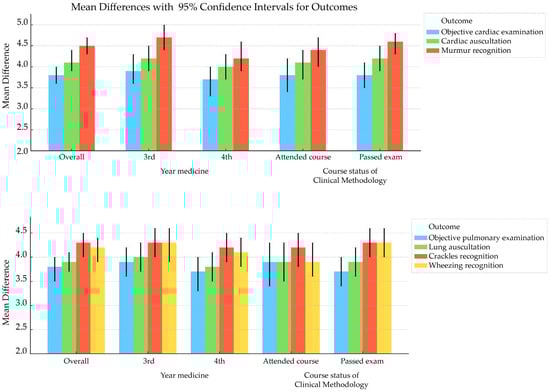 The figure presents mean differences in self-perceived thoracic examination skills across subgroups. The top graph shows outcomes for cardiac examination, cardiac auscultation, and murmur recognition, while the bottom graph displays outcomes for pulmonary examination, lung auscultation, crackle recognition, and wheezing recognition. Bars represent mean differences (Post–Pre) with 95% confidence intervals.