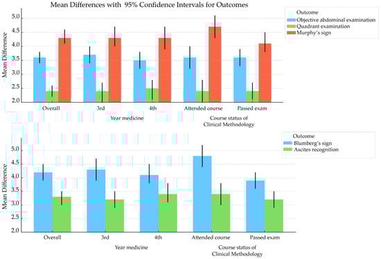 The figure presents mean differences in self-perceived abdominal examination skills across subgroups. The top graph shows outcomes for objective abdominal examination, quadrant examination, and Murphy’s sign, while the bottom graph displays outcomes for Blumberg’s sign and ascites recognition. Bars represent mean differences (Post–Pre) with 95% confidence intervals.