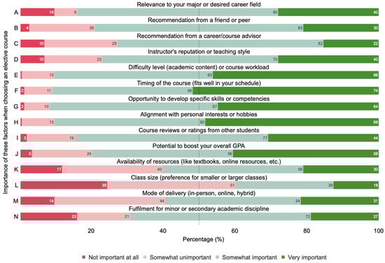 Referring to the results in Figure 1, factors E, F, G, and H are highly important (≥ importance rating) to students when choosing non-core courses. These factors can be categorized into “Practical Considerations” and “Personal and Professional Development”. In particular, students prefer courses that match their perceived ability to handle academic content and workload. They also prefer courses that fit their schedules rather than dealing with classes with conflicting schedules. The most important factor for students from our survey indicates a strong desire by students to choose courses that allow them to gain skills and competencies that will benefit their academic and professional careers. Many students also value courses that align with their interests, indicating a preference for engaging and enjoyable learning experiences. The results from statements A, B, C, D, I, and J indicate that, while important, they might not be the primary drivers of course selection (≥ importance rating). These factors can be categorized into “Academic Relevance” and “Social Influence”. When choosing an elective, a sizable number of students still take into consideration their major and its potential impact on their grade point average (GPA) (factor J). This suggests that while non-core courses are meant to broaden and deepen students’ academic exposure in fulfillment of their major or secondary academic discipline (factor N), relevance to their degree program and impact on future careers is predominantly of greater importance to students. Peer recommendations, either from a friend or past course ratings and evaluations, are moderately important in influencing decisions but are not the primary factor for most students. Lastly, the participants rated factors K, M, and N as less important, with L as the least important.